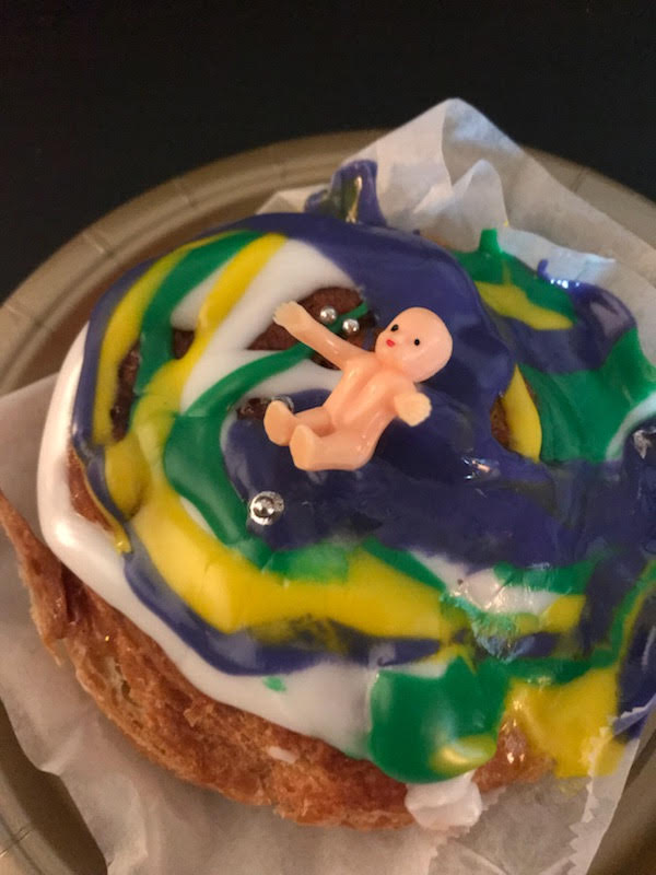 [Prior to choking hazards] A small plastic or porcelain baby was hidden in the king cake to symbolize baby Jesus. Tradition has it the person who gets the piece of cake with the baby has various privileges and obligations including being crowned “king” and bringing the next years King cake.